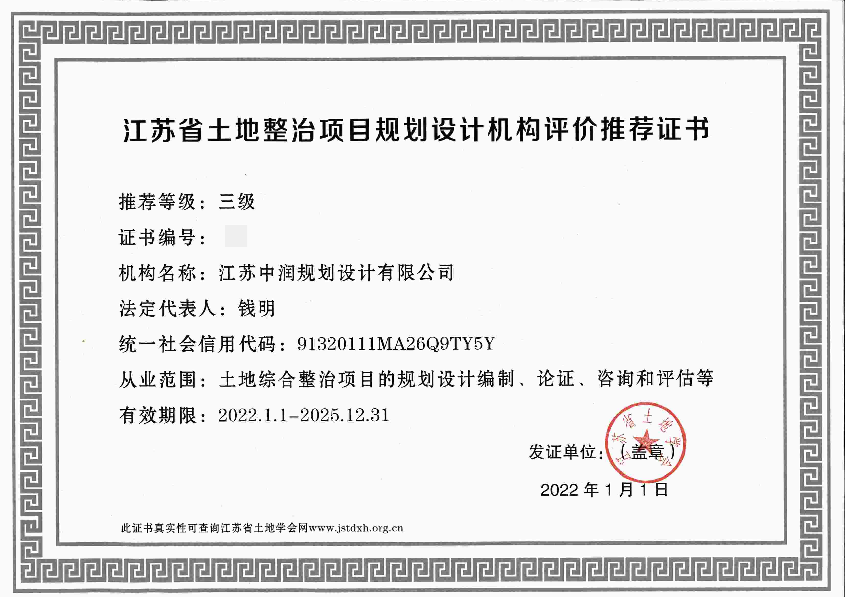取得江苏省整治项目规划设计机构评价推荐证书(三级)