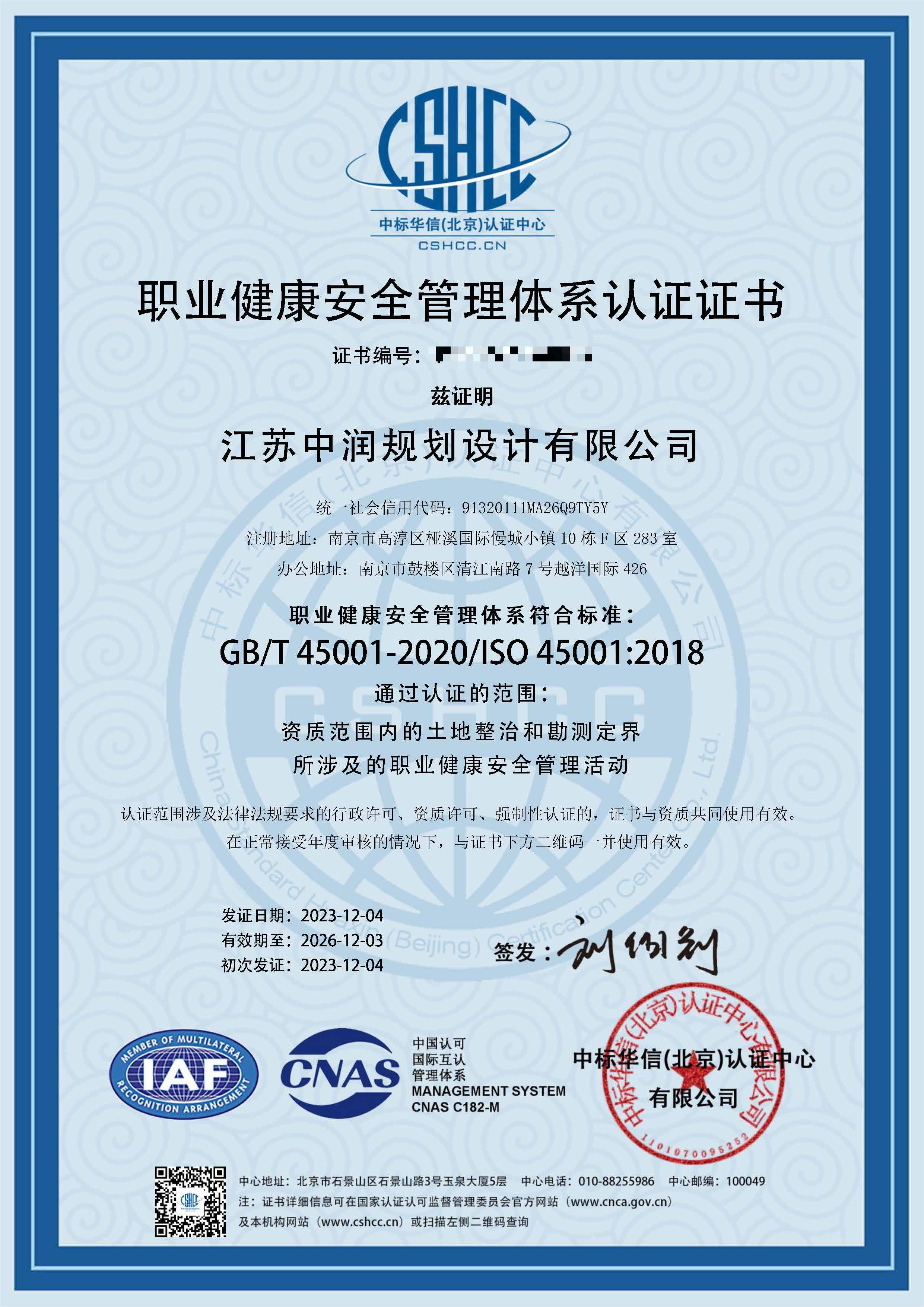 取得职业健康安全管理体系认证证书