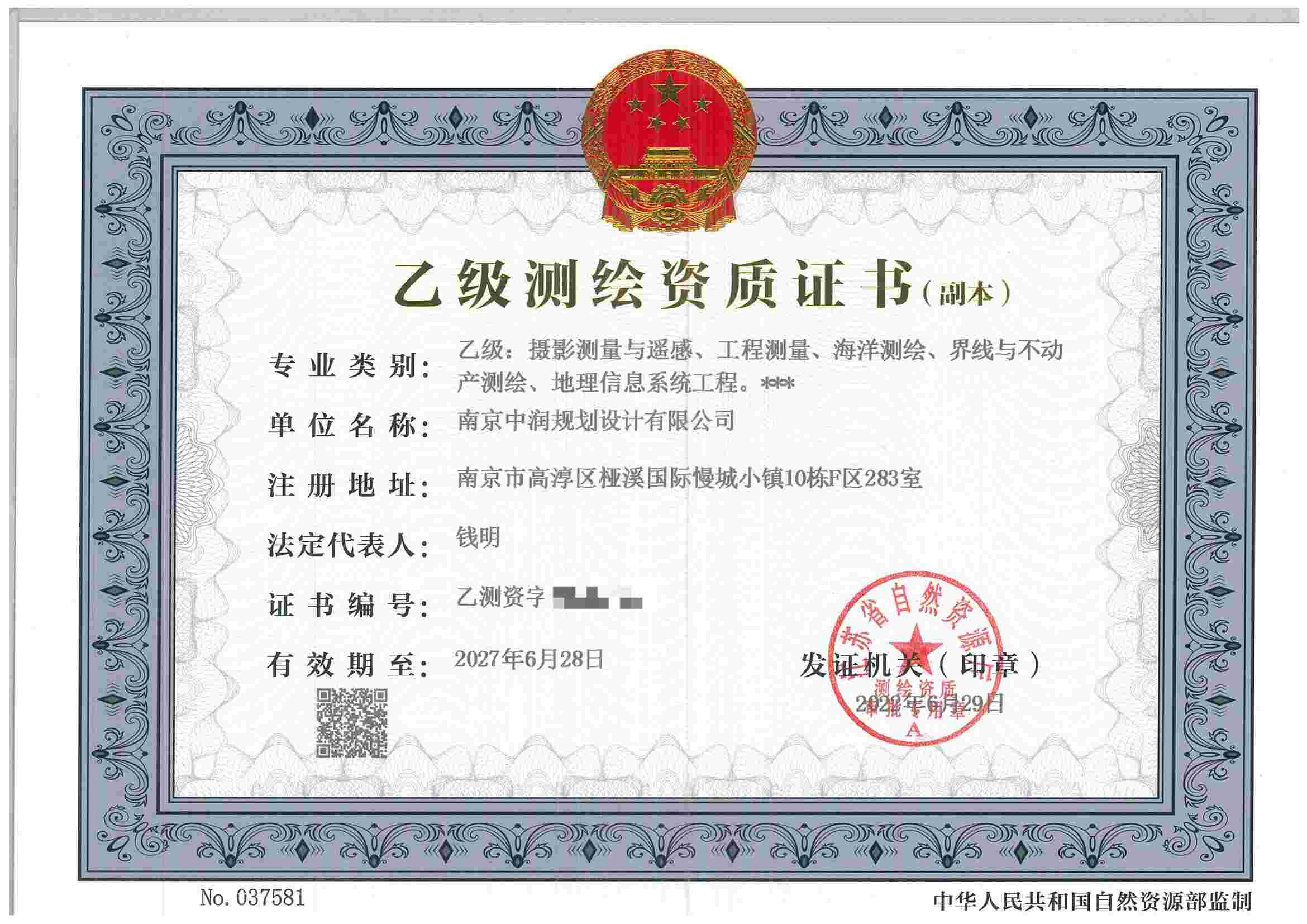 取得测绘乙级资质证书