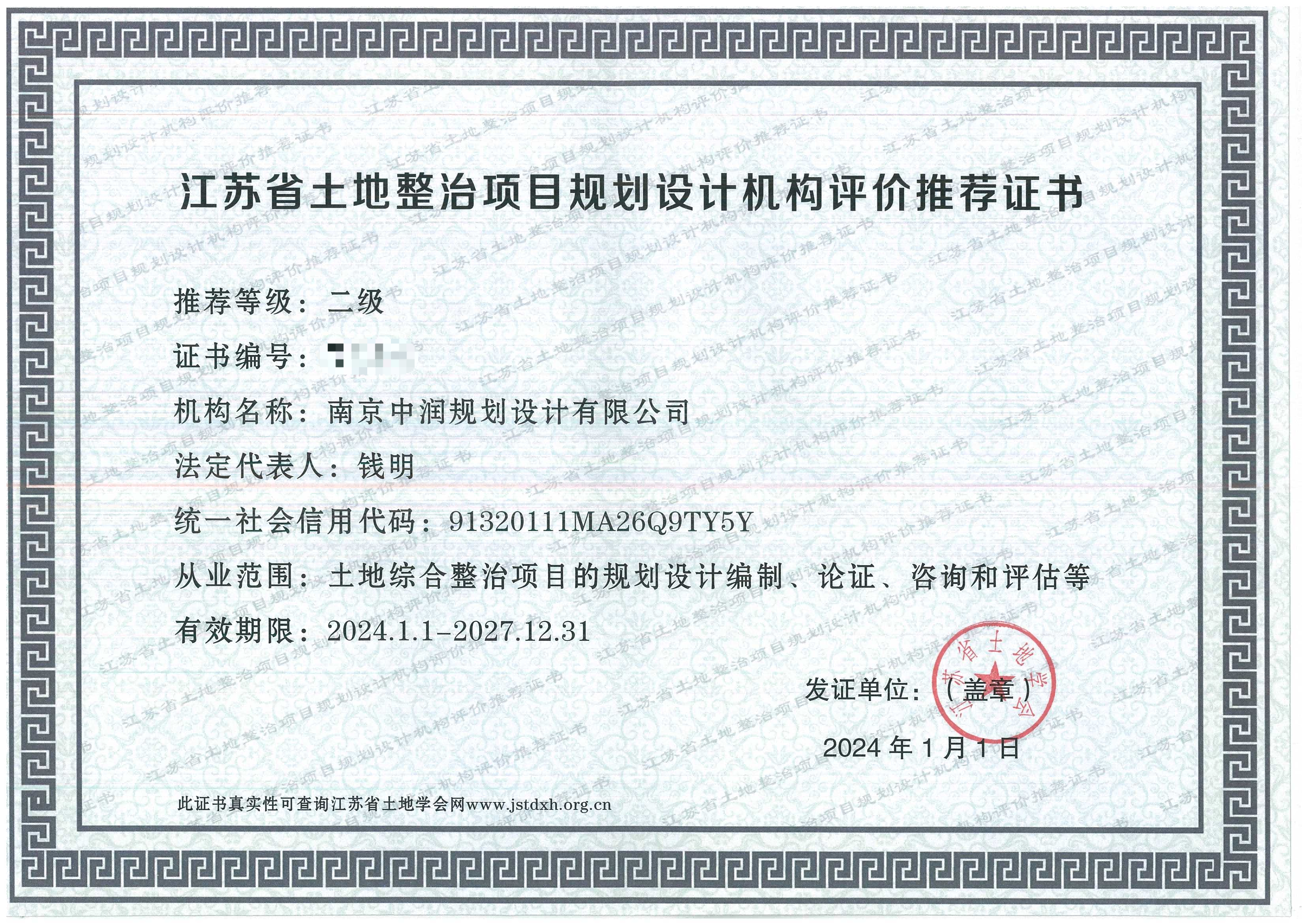 取得江苏省整治项目规划设计机构评价推荐证书(二级)